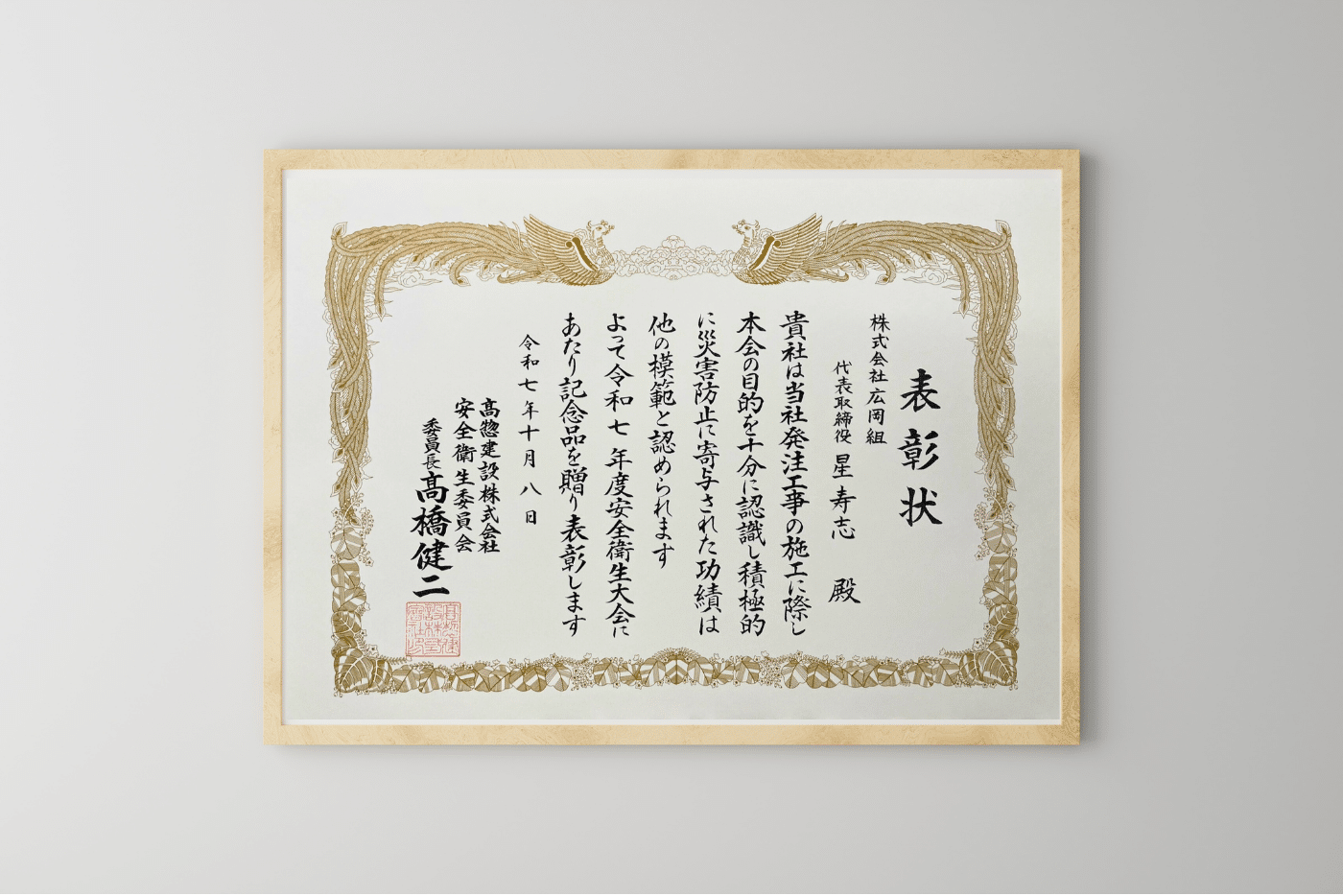 この度、当社は、高惣建設株式会社様より、令和7年10月8日に開催されました「令和七年度 安全衛生大会」におきまして、日頃の安全衛生への取り組みが評価され、表彰を受けましたことをお知らせいたします。