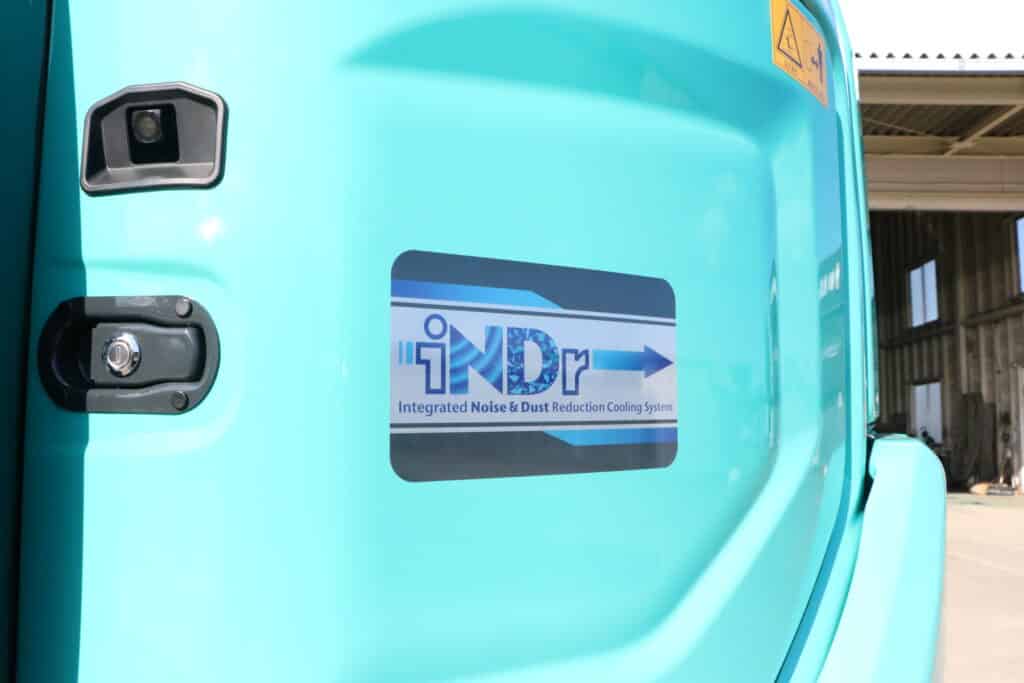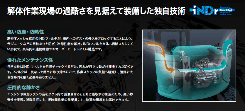解体工事現場にとって最大の課題ともいえる「粉塵(ホコリ)」と「騒音」。今回導入したSK75SRDには、これらを同時に解決するコベルコ建機だけの革新的な技術「iNDr(Integrated Noise & Dust Reduction Cooling System)」が搭載されています。
