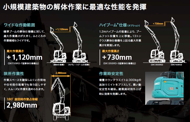 SK75SRDの導入により、これまで大型重機が入れなかった狭い現場や、繊細な操作が求められる解体工事においても、広岡組ならではの「安全・迅速・丁寧」な施工をさらに強化してまいります。