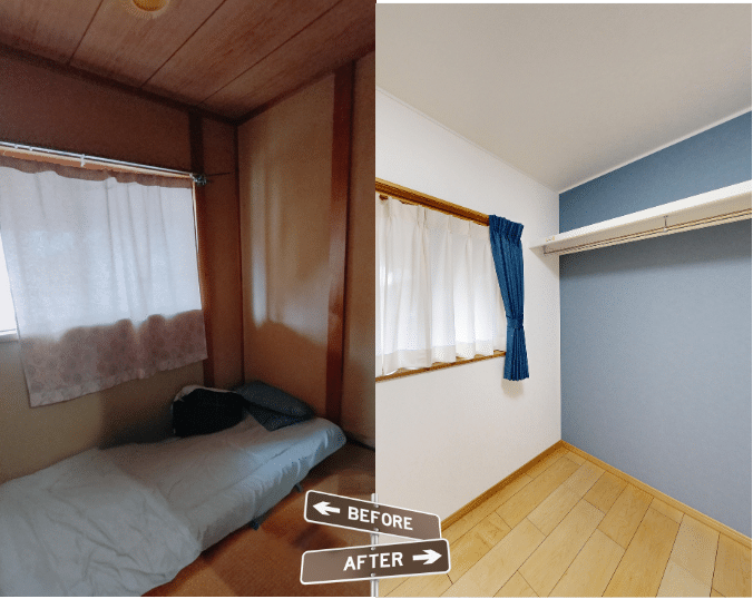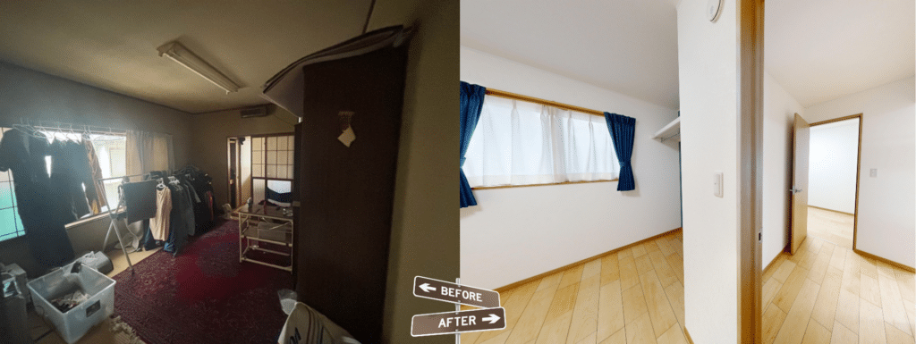 快適なプライベート空間の創出(寝室):和室から洋室への改修や、壁・天井・床材を一新することで、明るくモダンで落ち着いた寝室を実現しました。一部の部屋では、水回り(洗面台)を新設するなど、利便性も高めています。