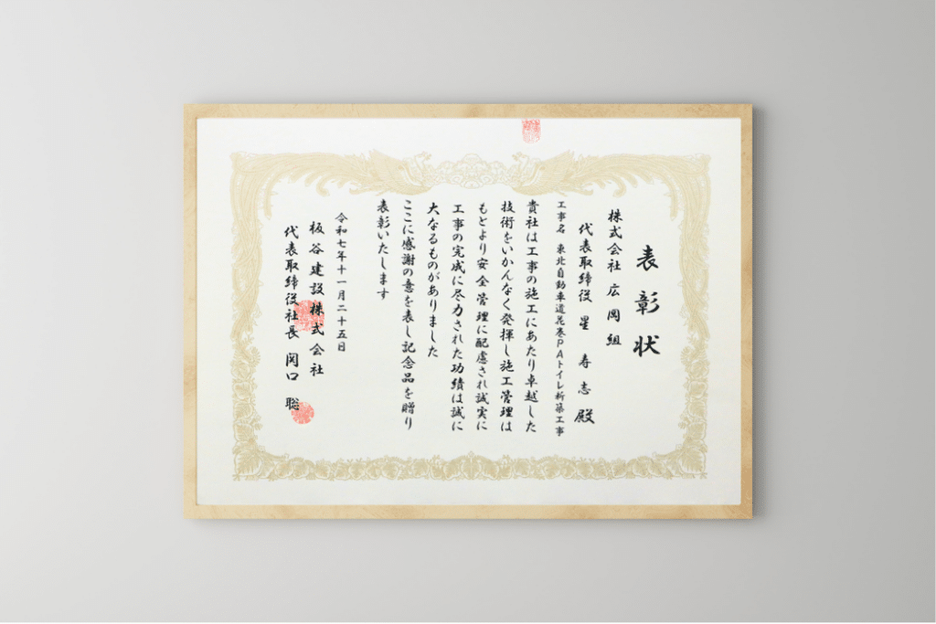 【表彰】板谷建設株式会社様より表彰状を拝受